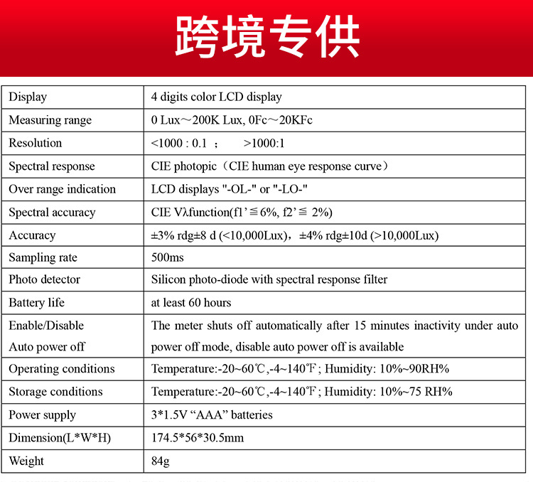 ±3% rdg±8 d (<10,000Lux),±4% rdg±10d (>10,000Lux) |